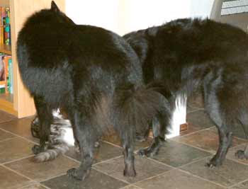 Jelle en Sicco staan eens geïnteresseerd aan Timber onze jonge Maine Coon kater te snuffelen. Zo fors als Timber destijds schrok van de eerste aanblik van die zwartjes, zo weinig is hij er nu van onder de indruk. Hij heeft ook niks van ze te vrezen, want ze hebben een heilig ontzag voor katten. |