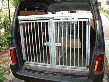 Hier zijn de autokennels klaar. Ze zijn groot genoeg en er kunnen eventueel twee honden in één vak (of 4 Border Collies, want die passen er ook in is proefondervindelijk vastgesteld). Bovenop de kennels is een laadvloer, zodat de nodige bagage kan worden meegenomen. Tussen de voorstoelen en de kennels is trouwens ook nog wat laadruimte. |