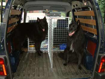 Thea wilde graag kennels in haar auto. Dus bestelde ze wat materialen en ging met hulp van André aan de slag. Natuurlijk moesten de mannen even kijken wat er met "hun" auto gebeurde. Met of zonder kennel, het maakt ze niks uit, als ze maar mee mogen. Op deze foto waren we even aan het uitmeten hoe de puppypanelen pasten. De mannen lieten meteen even zien dat de toekomstige kennels groot genoeg voor ze waren. |