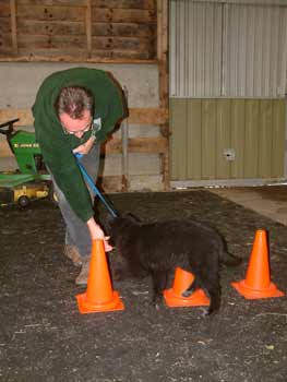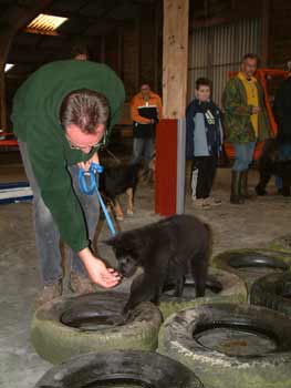 ![]() Eén van de onderdelen van de Puppy-Agility was een bandenparcours. Met behulp van een voertje werden de puppies over/door de banden geleid. Dasha moest eerst even goed aan de banden snuffelen, maar daarna liep ze er vlot overheen. |