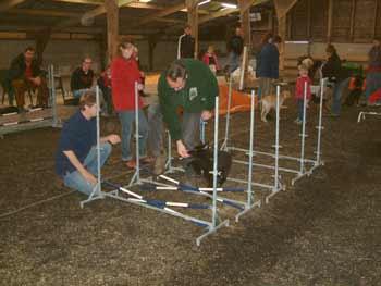 ![]() Tijdens de puppy-Agility vormde de tunnel weinig problemen voor Dasha. Ze ging er vlot doorheen. Toen hij wat meer gebogen lag, ging ze er wel even langs, maar toen André haar door de tunnel riep, kwam ze er dapper helemaal doorheen. uiteindelijk deed ze dit zelfs bij een tunnel die helemaal in een U-bocht lag! |