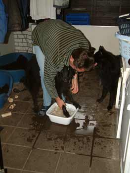 Om de bende niet allemaal in huis te krijgen, wast André hier de poten van de honden.