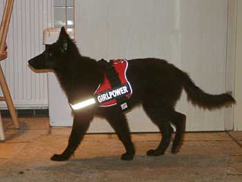 Dasha heeft voor het speuren een fraai blauw tuig met aan de zijkanten de tekst "pretty girl". Thea wilde voor Kalish eenzelfde tuig kopen, maar dan in een andere kleur en met een andere tekst. Via internet zijn ze eigenlijk alleen in zwart en army te koop, maar op de Winner waren ook andere kleuren. Dus kocht Thea daar een mooie rode voor Kalish. En aangezien Kalish een stoere meid is, kwam daar de tekst "girlpower" op te staan. Het tuig is op de groei gekocht, dus nu zwemt Kalish er nog in. Maar het is wel stoer ...;-) |