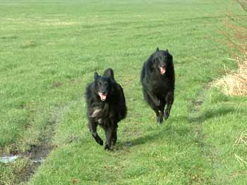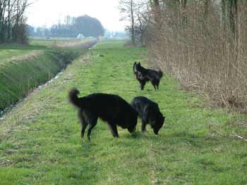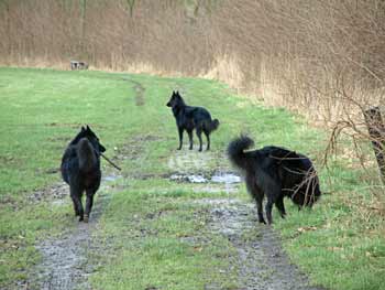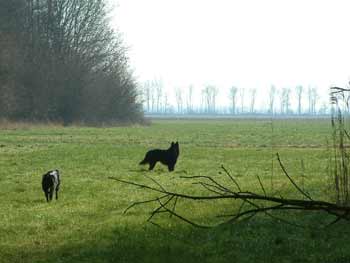 | Wat foto's van het Visvijverbos, waar we dagelijks een of meer wandelingen maken. Het zijn eigenlijk een aantal grote velden, die door bosstroken gescheiden worden. De honden kunnen er heerlijk los hun gang gaan. | |
