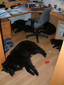 Het is niet zo'n grote kamer (sterker nog, vrij klein!), maar ze "proppen" zich gezellig met z'n allen in het hokje. Op de foto liggen Jelle (links) en Dasha (rechts) onder het bureau. Daar liggen ze heel veel. Sicco ligt meestal waar hij op de foto ook ligt, lekker languit in het kamertje. Kalish ligt veel tegen de stoelpoot aan, maar ook wel, zoals hier, wat meer opzij. Wat zichtbaar is op de foto is ook ongeveer alle loopruimte in het kamertje. Thea mag er dus tussendoor wurmen om haar plekje op de stoel in te nemen. Wat op deze foto niet zichtbaar is zijn de twee kattenmandjes in de vensterbank, waar het kattenvolk meestal in ligt als Thea aan het werk is... |