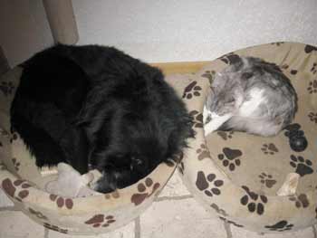 ![]() Jelle ligt graag in een van de manden. En Timber ook en die weet dat hij bij Jelle niet lastig gevallen wordt. En dus liggen ze hier samen, Jelle in de kleine mand en Timber in de grote... |