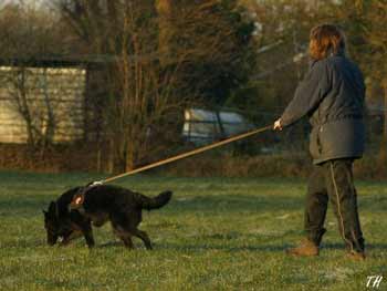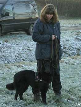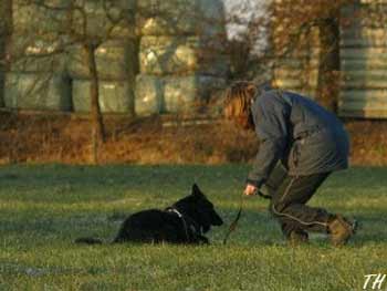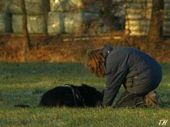 ![]() Als beloning vindt hij een bakje worst en gaat er keurig bij liggen |