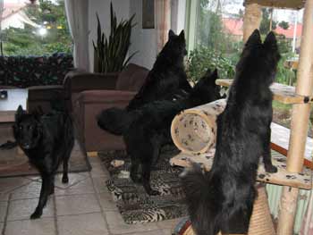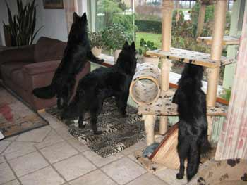 ![]() Groot alarm... Wat is er aan de hand? Dasha heeft al gezien dat het niks is, die loopt weer weg. Ace staat nog in de vensterbank, Auke ernaast en Kalish torent boven de kattenpaal uit. |
