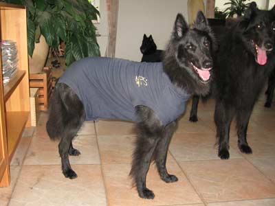 ![]() Beide dames met hun rompertjes, net "Combat" ladies Alleen Caspian moest er even aan wennen, hij schrok zich eerst lam van die rare wezens... Op deze foto staat Ace natuurlijk weer aan de dames te snuffelen... hij moet altijd alles met de neus controleren |
