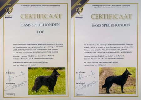 Kalish en Pella doen mee aan het KNPV-examen Basiscertificaat speurhonden. In zeer stormachtig weer speuren de dames goed. Daarna gaat het regenen en wordt de rest van het examen in de regen afgelegd. Desondanks slaagt Kalish Met Lof. Pella slaagt ook, maar net niet met lof. |