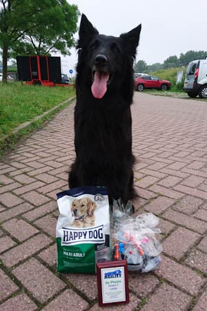 Ace is inmiddels weer lekker op dreef in de agility. Hij is zijn gezondheidsproblemen van vorig jaar te boven, maar heeft wel duidelijk aan spierkracht en snelheid ingeleverd. Dat gaat niet meer terugkomen gezien zijn leeftijd (ruim 10 jaar) en het feit dat hij gecastreerd is. Doordat hij wat trager is, kan ik hem beter bijhouden en sturen en dat levert foutloze rondjes op. Hij scoort in Bemmel zelfs twee prijzen! Omdat Ellis toe is aan een ruimere trainingslocatie en Ace in zijn nadagen is, ruilen ze in oktober van trainingsplaats. Ellis mag in de manege gaan rennen en Ace traint dan in de kas. Ik had hem eigenlijk met pensioen willen sturen, maar hij heeft er nog zo'n lol in! Zolang hij het lichamelijk aan kan, mag hij nog even doorgaan in de agility. |
