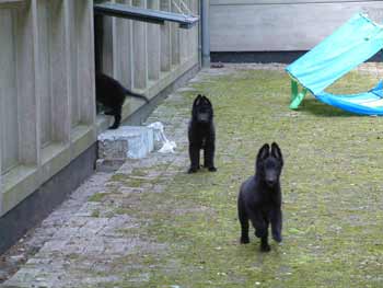 | 06-08-2008 | De buitenren is nu af en de binnenkennel ook. De puppen hebben daar lekker de ruimte. Ze hadden ook al snel door dat ze naar binnen konden. |
