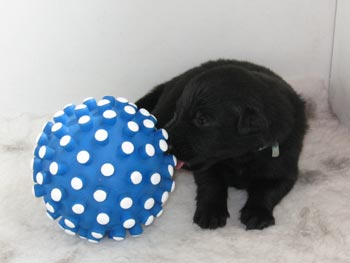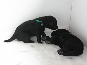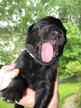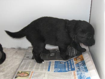 | 22-06-2008 | Gisteren hebben we een krantje in de werpkist gelegd en de puppen doen er netjes hun behoefte op! Vandaag hebben we een balletje geintroduceerd, maar dat vinden ze nog niet echt bijster interessant. De puppen gaan steeds beter lopen, hoewel ze ook regelmatig omrollen en de prachtigste buitelingen maken. Een aantal puppen hebben de oortjes open. |