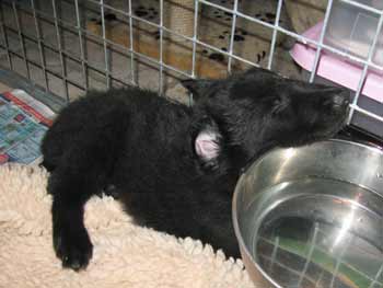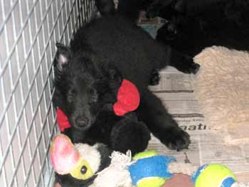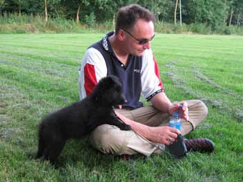 | 23-07-2008 | De puppen hebben een drukke dag gehad: eerst bezoek, en toen 's avonds mee naar de hondenclub. Het hele spul in de auto, rennetje mee, bench mee, een hele verhuizing. Daar hebben ze allemaal (2 aan 2 of alleen) over het veld gelopen en met andere mensen en honden kennis gemaakt. En toen weer in de auto terug. De bak eten ging er daarna heel vlot in en na een laatste robbertje stoeien vielen ze in diepe slaap. |