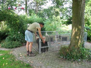 | 25-07-2008 | Met dit mooie weer zitten de puppen veel in een buitenrennetje. Ze graven echter het gras kapot en het is minder goed schoon te houden. We hebben het rennetje dus maar op het terras gezet. Ook hebben we er een stuk aan vast gemaakt, zodat ze wat meer ruimte hebben om te dollen. |