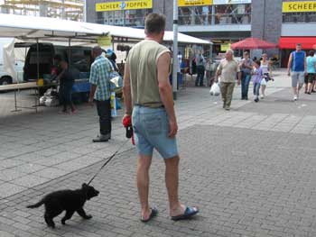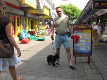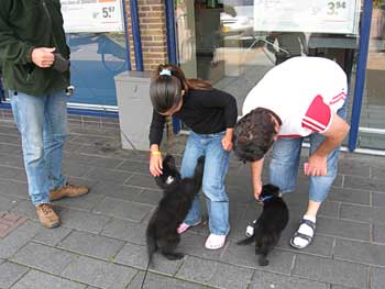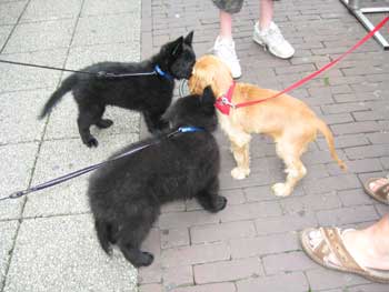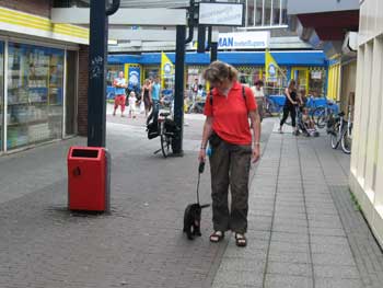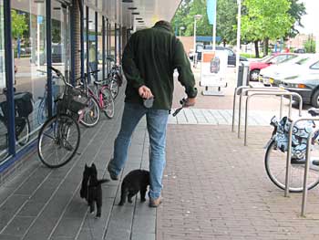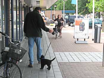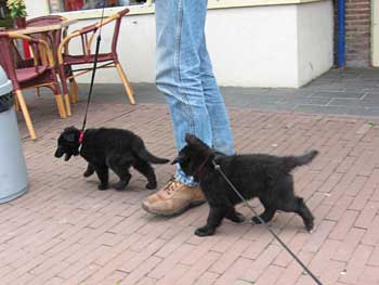 | 26-07-2008 | De puppen zijn vandaag naar Lelystad geweest. Een voor een hebben ze de winkelstraten verkend. André liep steeds een stukje voor Thea uit. Op de terugweg kwamen de puppen elkaar dan tegen en liepen het laatste stukje samen naar de auto. Tja, wat kom je als pup zoal tegen: overdekte parkeergarage, overdekt winkelcentrum, gewone winkelstraten, markt, kinderen, volwasenen, witte mensen, gekleurde mensen, kinderwagens, rolstoelen, andere honden, allerlei geluiden, etc... Ze waren er niet van onder de indruk. We kregen verschillende complimenten dat de pups zo sociaal waren. En daar zijn we blij mee! |