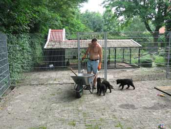 ![]() André is bezig wat gaten te dichten in de ren. De puppen "helpen" hem dapper mee met klussen en zorgen ervoor dat de gaten snel weer open liggen...(op de achtergrond ons kippenhok) |