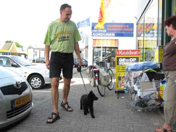 | 29-07-2008 | Vandaag zijn de puppen weer meegeweest naar Lelystad. Een ander winkelcentrum dit keer, zodat ze steeds weer een nieuwe omgeving meemaken. Ze vinden het steeds normaler om aan de riem langs de winkels te lopen en dat is precies waarom we het doen. |