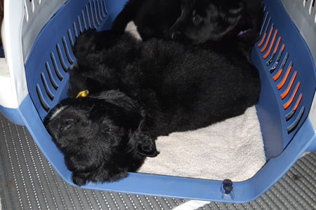 | 05-01-2021 | In de ren heb ik een 'bench' gezet. Eigenlijk een van de kattenmandjes en het deurtje heb ik er even uit gehaald. Ik heb hem alleen neergezet, maar de puppen hadden hem al heel snel ontdekt als lekker slaapplekje. Zo ga ik dat langzaam opbouwen, zodat de puppen uiteindelijk een bench als een normaal fenomeen gaan zien. |