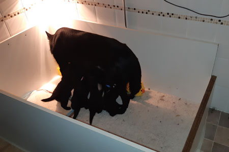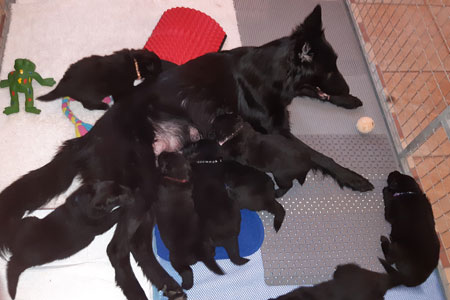 | 07-01-2021 | De puppen worden nu zo groot dat ze bijna de werpkist uit kunnen kruipen. Ze worden nog steeds alleen door Ellis gevoerd. Ellis eet nu 3x haar normale hoeveelheid brokken plus nog een kilo vlees, alles verdeeld over 5 maaltijden per dag, dus er komt ook nog steeds veel uit en de wekker staat nog steeds voor een nachtelijk uitlaatrondje. |