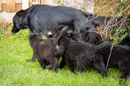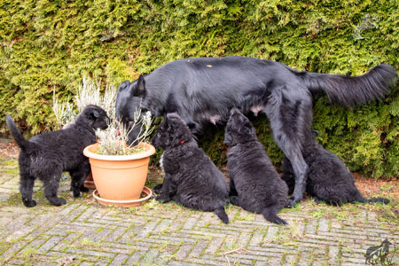 | 30-01-2021 | De laatste dagen braakt Ellis haar voedsel op voor de puppen. Dat is heel mooi, natuurlijk gedrag. Ik moet wel even oppassen wanneer ik haar haar antibioticapillen geef, want die moeten niet in een pup terechth komen. Ze krijgt ze nu later, verpakt in een paar blokjes kaas. Ik vind het prachtig om te zien hoe Ellis met de puppen omgaat. Hier en daar corrigeert ze er een op een rustige manier, ze is nog steeds heel zorgzaam en ze heeft nog veel melk. |