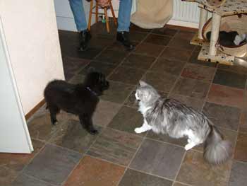 Timber is ondertussen geheel gewend aan de twee grote honden. Maar als Dasha haar intrede doet, is hij behoorlijk uit zijn doen. Wat is dat nou voor raar klein mormel ?!? Hij blijft er wel steeds bij in de buurt, want het intrigeert hem enorm, maar hij vindt het wel eng. Op deze foto een van de eerste contacten. Dasha is katten gewend en vindt Timber dus niet iets speciaals. Ze is meer bezig met te bevatten waar ze terecht is gekomen. |