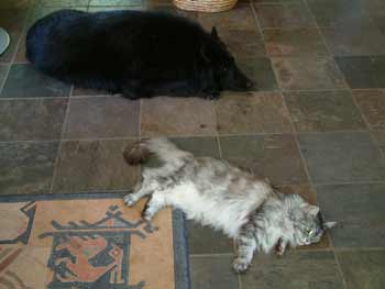 Tessy ligt hier samen met Sicco op de grond. Katten liggen niet snel op de grond, maar als ze met honden samenleven doen ze dit wel vaak.