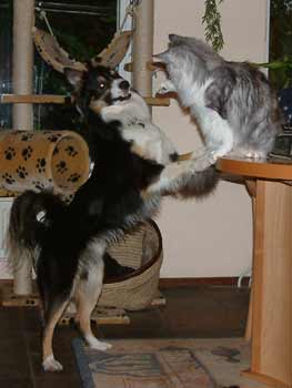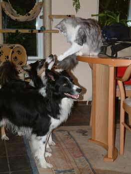 Timber en de Borders De Borders Beer en Bengel van Hans zijn niet echt gewend aan katten. Bengel is vroeger flink door een kat toegetakeld en heeft het er dus niet zo op. Zelfs niet op Timber, die toch écht nog nooit gehoord heeft van meppen. Hier heeft hij wel zijn pootje omhoog, maar dat gaat puur speels. Timber vindt Borders net vreemd gekleurde Belgen, dus eigenlijk niet echt spannend. Maar je kunt er wel grappig mee spelen. |