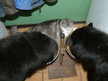 Als de honden 's avonds eten krijgen, vindt Timber het wel interessant om te kijken wat er allemaal gebeurt. Ook vindt hij het wel gezellig om erbij te gaan liggen. Hier ligt hij er wel héél gewaagd bij. Maar ondanks dat de "mannen" een beetje grommerig waren (eten is immers belangrijk), blijft Timber gewoon liggen. En zolang hij niet nog dichterbij de etensbakken komt, vinden de honden het ook wel best. |
