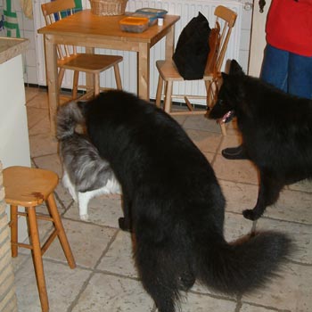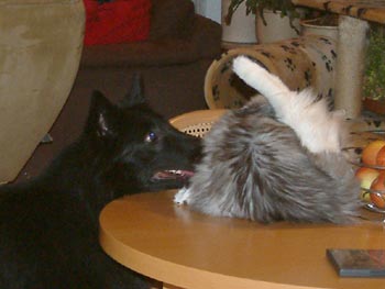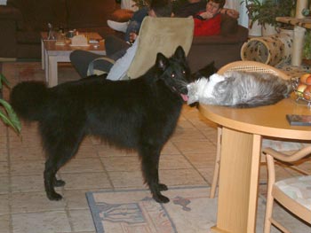 Timber is natuurlijk gewend aan honden. Maar hoewel dit hier een normaal plaatje lijkt, is dat niet zo. Deze Groenendaelers zijn namelijk niet die van ons, maar die van vrienden. Die hebben er ook drie en die kwamen met het hele trio de jaarwisseling bij ons doorbrengen. Hoewel hun honden niet gewend zijn aan katten, gedroegen ze zich voorbeeldig. En Timber vond het ook wel best. Hij zal wel gedacht hebben: "Al die zwarte beesten zijn één pot nat." Vooral de jongste hond Neo vond het erg interessant zo'n kat (onderste twee foto's). Af en toe werd hij wel wat opdringerig, maar Timber vond hem toch ook wel grappig. En verder loste hij het op door gewoon op de tafel te gaan liggen (lekker pesterig dichtbij, maar toch ook net buiten bereik...echte kat). |