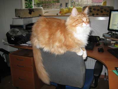 Als ik aan thuis aanhet werk ben, zit Caspian er graag bij. Hij kiest dan niet altijd logische plekken uit. Regelmatig ligt hij dan op de rugleuning van mijn bureaustoel, tewijl ik op die stoel zit! hier een plaatje van hoe 'comfortabel' dat is... |