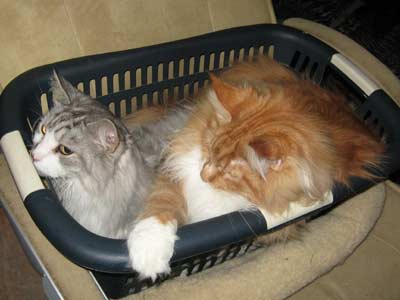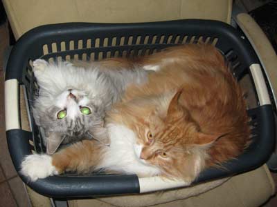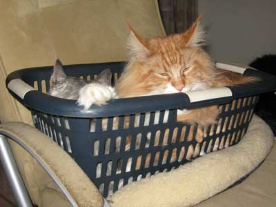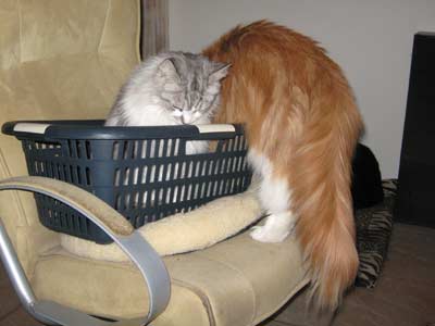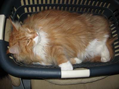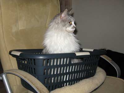 ![]() Een wasmand... Timber heeft hem snel ontdekt als lekker plekje om in te zitten/liggen |