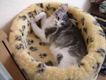 Timber ligt weer eens lekker in het mandje. Hij groeit als kool en is hier ruim 14 weken oud. Hij begint het mandje al aardig te vullen. Het is niet zo'n heel groot mandje, dus er komt een moment dat hij er niet meer in past!