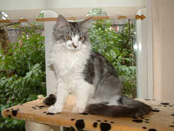 Timber begint al een flinke vent te worden. Hoeveel hij nu precies weegt weet ik niet, het zal ongeveer 3,5 kilo zijn of wellicht wat meer. Hij krijgt steeds meer kraag en heeft al een mooie pluimstaart. Op deze foto lijken zijn ogen donkerder dan ze zijn. |