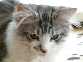 Toen we Timber in huis kregen, had hij al wel de gekleurde vlek naast zijn neus. Zijn neus zelf was voor 2/3 zwart. Boven zijn neus was hij (dachten we) wit. Er kwam echter steeds meer kleur boven zijn neus. Eerst dacht ik dat het kwam doordat hij een wondje op zijn neus had (mep van Tessy gekregen). Dat was het echter niet. Hier op de foto kun je zien dat boven de gekleurde vlek naast zijn neus zich doorzet tot boven het zwart van zijn neusje. |