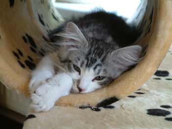 Timber ligt lekker lui in het tonnetje van zijn klimpaal. Door twee tonnetjes achter elkaar te monteren is hij nu lang genoeg voor een Maine Coon. Op deze foto is Timber zo'n 13 weken oud.